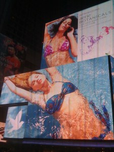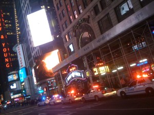 Here’s a sight from last night that I thought was especially salient in illustrating the rather pitiful combination of things our country sometimes stands for: a long chain of NYPD cars with flashing lights (show of force) parked beneath a preposterous array of energy-guzzling advertisements. Brute strength and consumption. Brilliant.